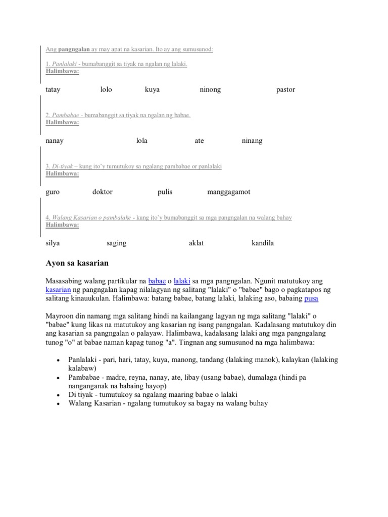Ang kasarian ay isang pangkaraniwang pag-uuri ng pangngalan. Play this game to review undefined. Ang malabong pagkakaiba sa pagitan ng babae at lalaki ay maaring magbunga sa mga maling katuruan gaya ng inaamang Diyos at ang Banal na Espirtu bilang bagay lamang o kapangyarihan ng Diyos at ipinagsasawalang bahala ang pagtukoy sa Banal na Espiritu bilang isang lalaki sa Kasulatan Juan 1417.