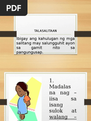 Isulat ang nabuong salita sa inyong papel 1. Iyon ay ilang mga eksena mula sa mga comic book ay ipinakita nang walang anumang dayalogo. MGA KAHULUGAN SA TAGALOG.